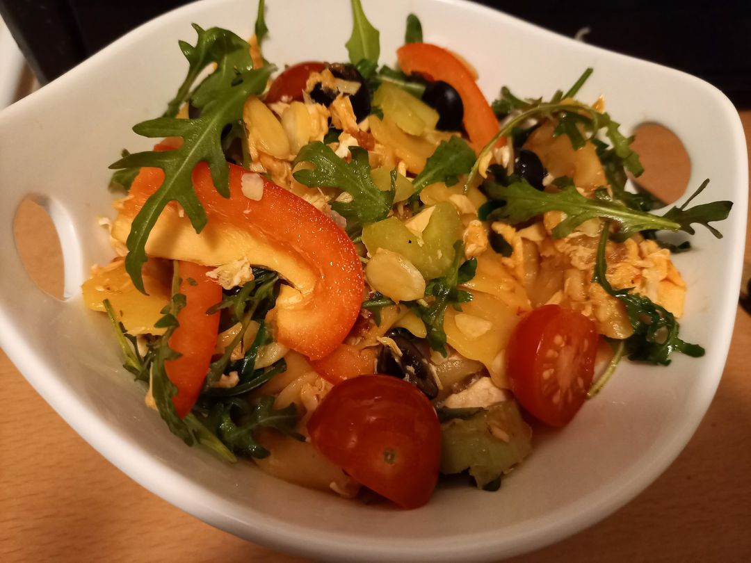 Lunch: wholemeal roll with peanut butter and rocket, a salad with a load of things in (including chickpeas), an apple Evening meal: A veggie version of Quiche Lorraine (fake bacon, vegan cheese, I make my own crust from oats, flaxseed, and almonds), the rest of the salad, rocket, walnuts.