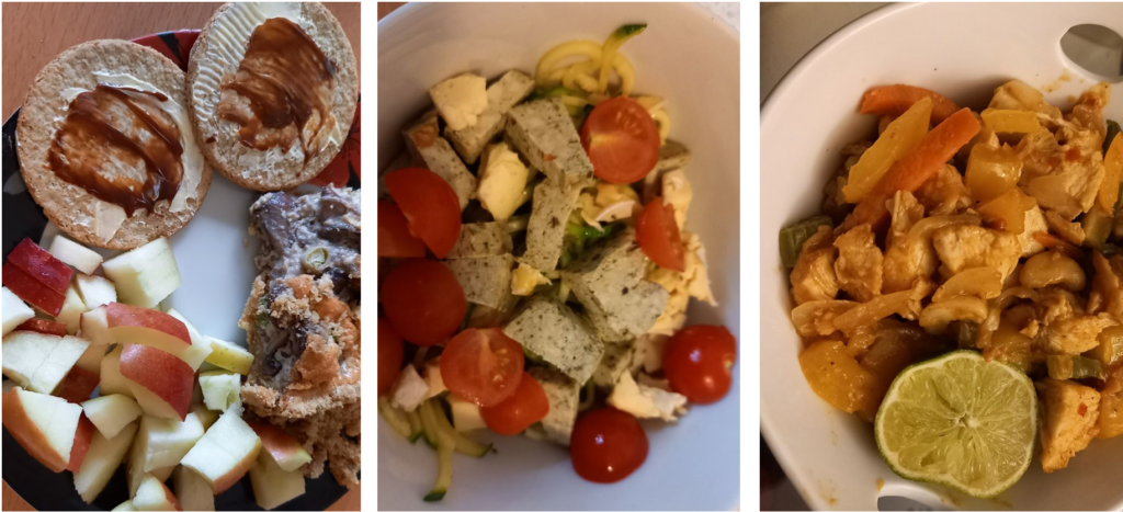 Left to right: Breakfast = small plate (apple, oatcakes with marmite, remaining quiche) Lunch = small bowl (tofu, tomatoes, vegan camembert, courgetti) Evening meal = deep ramen bowl may as well be a bucket! (chicken, cashews, yellow pepper, celery, onion, carrot, garlic, courgette, satay sauce, lime juice, wild rice)