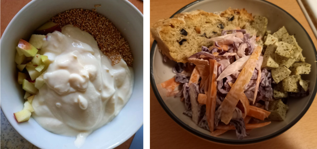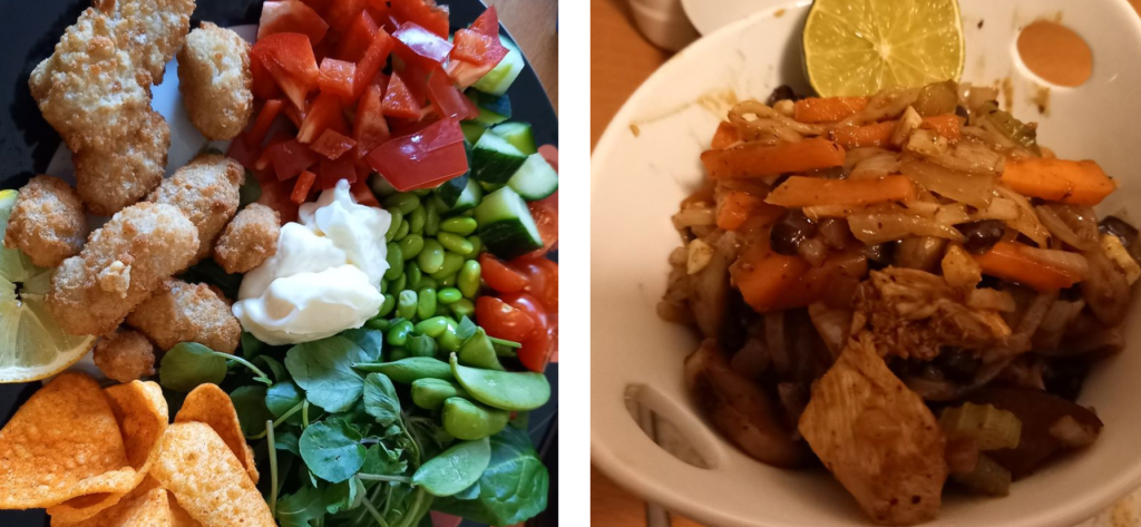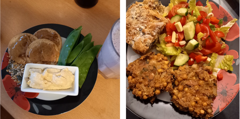 Left: Yeast extract and peanut butter on oatcakes, mangetout, humous (using it up to make space in the fridge), seeds, and a strawberry milkshake which was strawberries and soya milk. Right: Olive cake, mushroom and chickpea burgers, salad with some vegan cheese in.