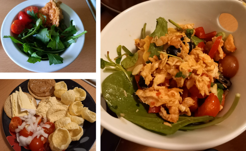 Top Left: Leftover quiche for breakfast. Bottom Left: Afternoon snack = a result of forgetting lunch; oatcakes, vegan camembert, peanut butter, humous, tomatoes, onion, lentil chips. Right: That salmon, salad, and pasta thing that we eat every week. (On the bag of lentil chips, it says they’re 40% less fat. 40% less fat than what though?)