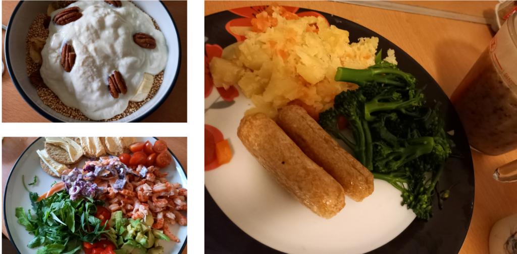 Breakfast and lunch, almost eaten at sensible times but no banana. Also… no banana. I do have one but it’s still green Evening meal not pictured but go take a look back at Day 7 – it’s more or less the same