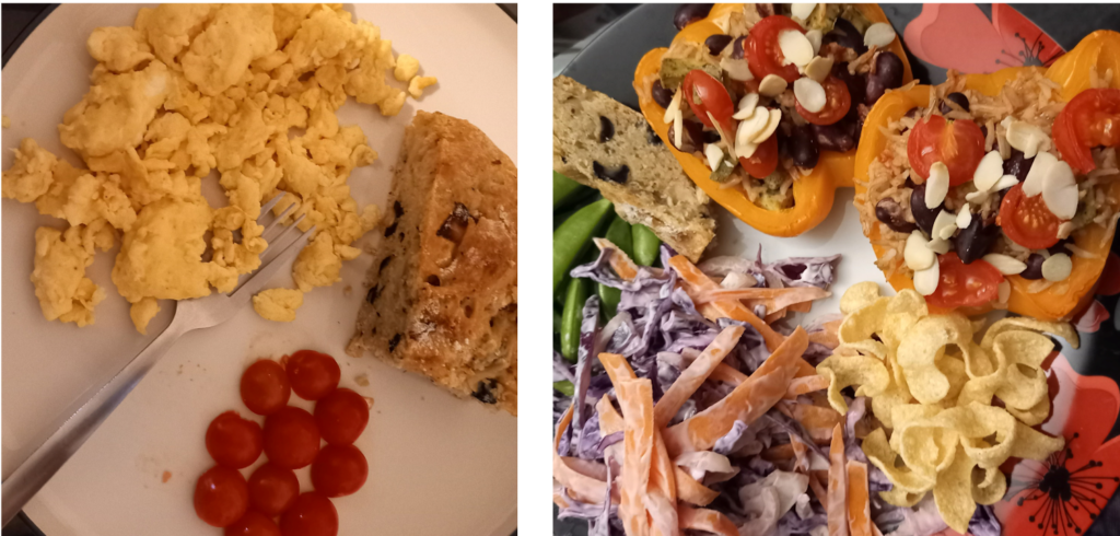 Left: PJ made me breakfast – I requested tomatoes be added! Right: Stuffed peppers, home-made coleslaw with red cabbage, sugar snap peas, less olive cake than with breakfast, lentil chips – they’re not all that but I hate to waste food!