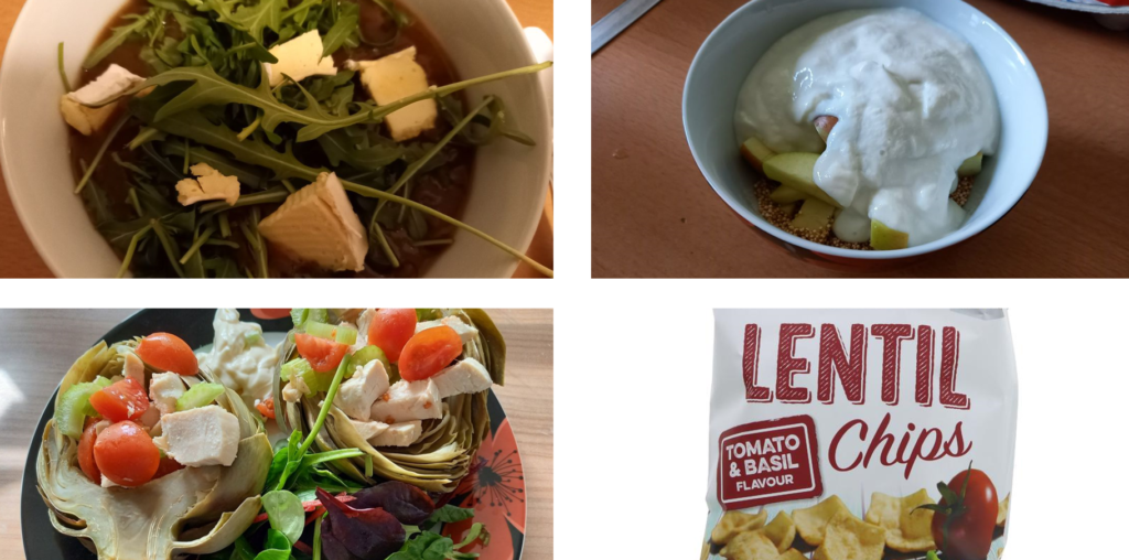 Top left: tin of soup with rocket and vegan camembert
