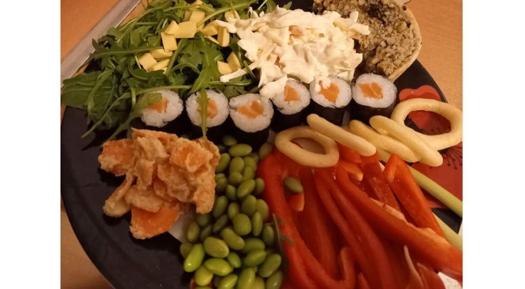 Right: Scampi, salad leaves, olives, vegan cheese, walnuts, tomatoes, mayo