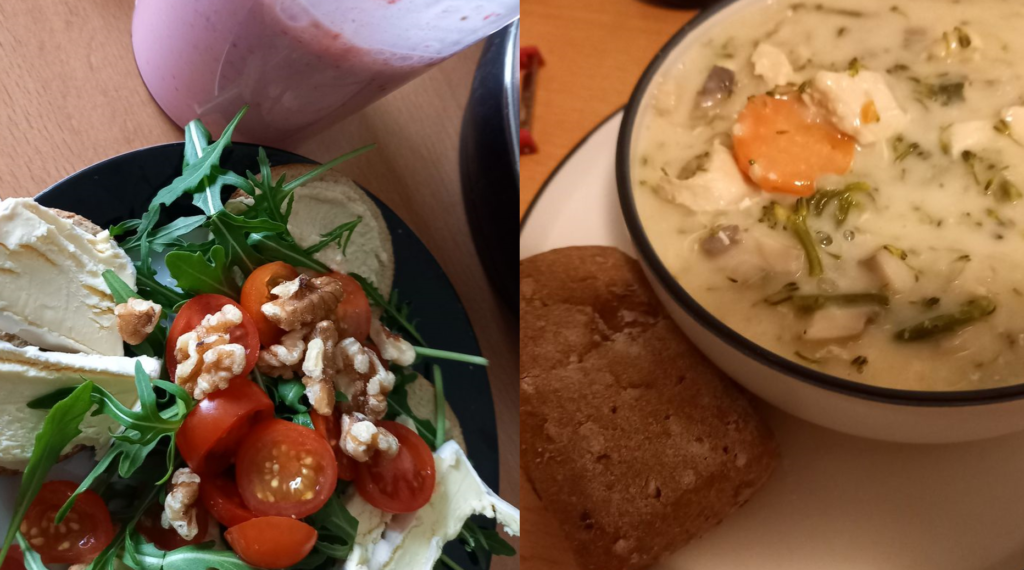 Bottom Right: Vegan cheese and broccoli soup, salad things (including walnuts ❤)