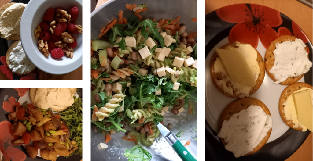 Bottom right: crackers with vegan cheese, one with marmite (I forgot to buy oatcakes)